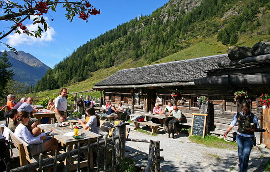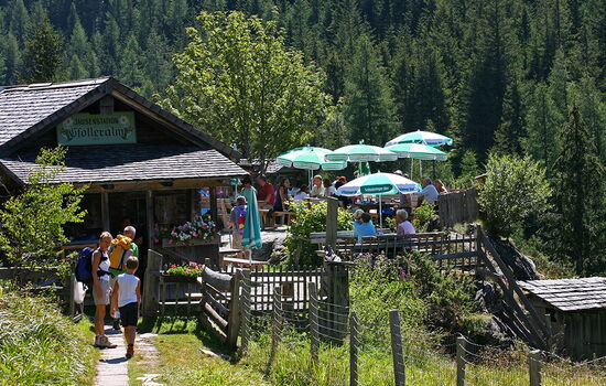 Sie wurde 1888 erbaut und derart vorbildlich in die Umgebung eingefügt, dass manch Wanderer an uns vorbeigezogen ist – die Alm steht in der Obhut eines riesigen Felsblockes. Obwohl die vergangenen 122 Jahre tiefe Furchen in die verwitterten Balken zeichneten, ist sofort klar, diese Hütte kann Wanderern garantiert noch lange Gemütlichkeit und Schutz für die Einkehr bieten.